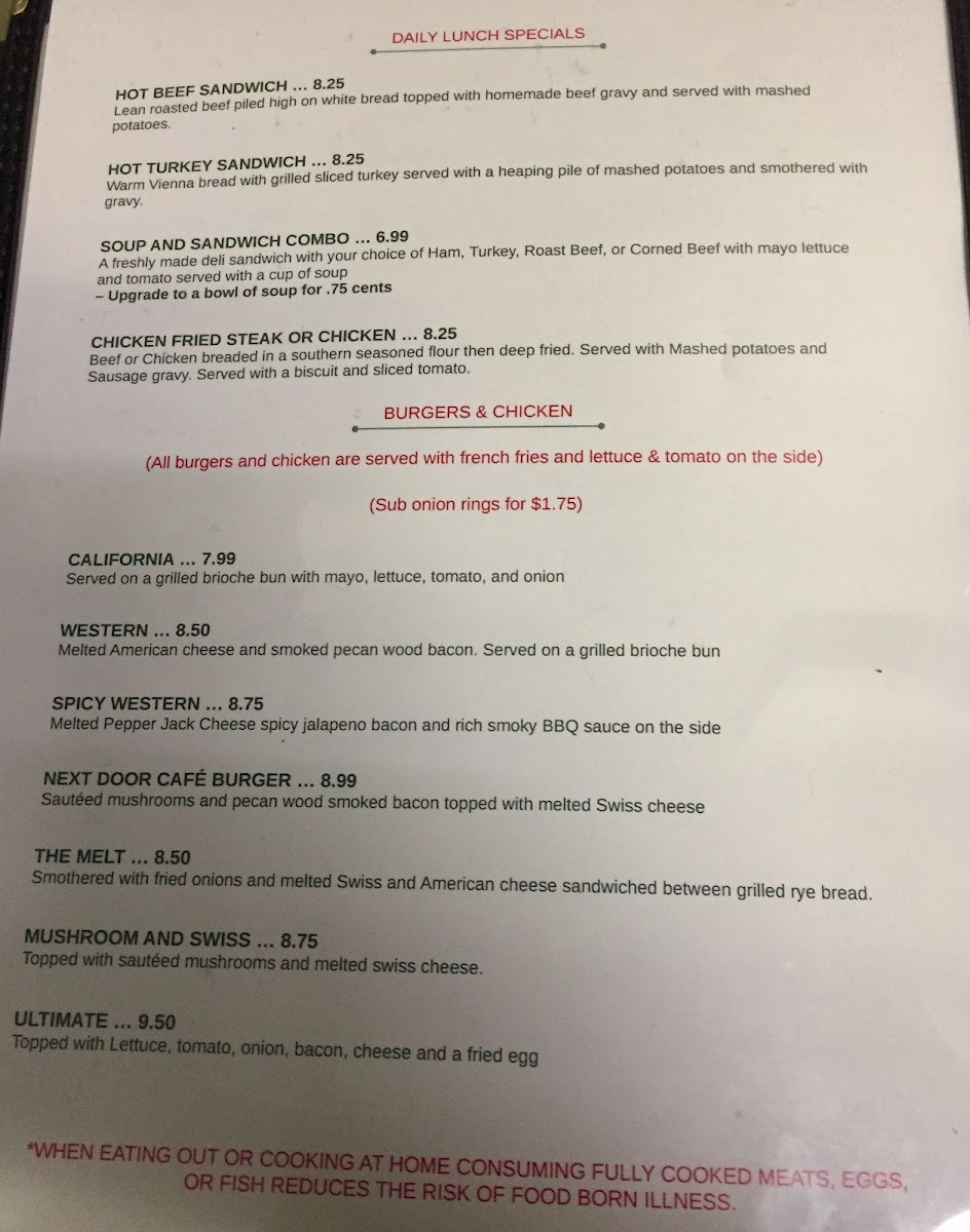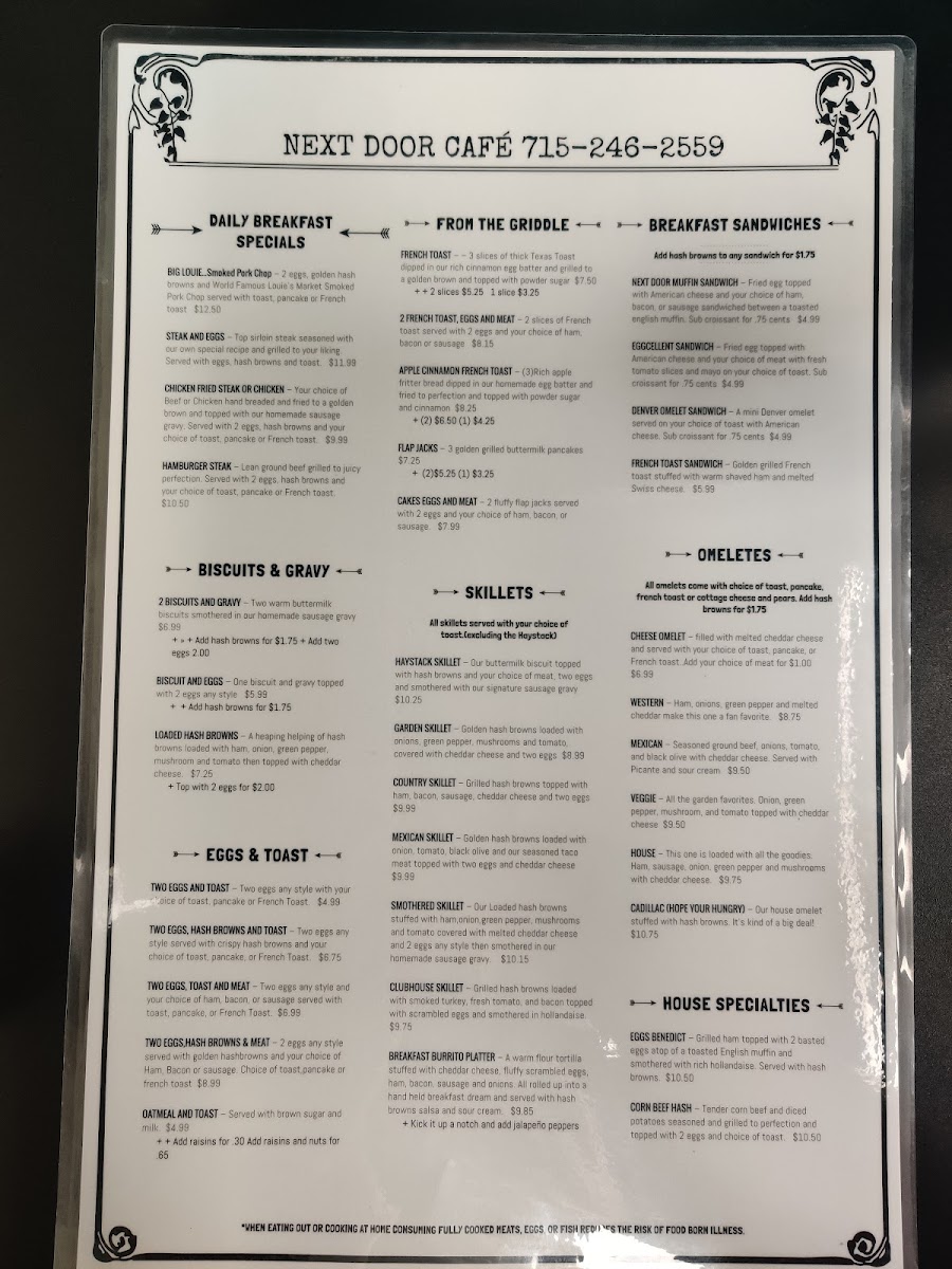 Welcome to Next Door Cafe, a charming establishment located at 206 S Knowles Ave in New Richmond, WI. This delightful cafe offers a menu designed to please any palate, showcasing comforting classics and delectable sweet treats. Start your day with their all-day biscuits and gravy or a loaded hash brown, both celebrated for their rich flavors and satisfying portions. For lunch or a casual meal, try the mouth-watering burgers like the Next Door Cafe Burger or the flavorful Western Burger. Don’t forget to indulge in their homemade cinnamon rolls, a customer favorite, that perfectly balances sweetness and warmth. Patrons rave about the excellent service and hearty meals, with many declaring it the best breakfast spot in town. With its inviting atmosphere and delightful dishes, Next Door Cafe promises to leave you craving more.